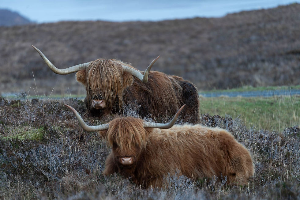 We continued on toward the village of Elgol anyway as we wanted to take photos of the Cuillins from behind and not far before the decent into the village - there they were - the magnificent herd (fold) of Highland Cows. I left our little cow mascot, Morag, in the car so I could give all my attention to the cows. Vince also decided to do an impromptu YaYa Vlog with them - I was in 7th heaven. Especially when a few of them came down of the hill and walked along the road with me, at me and around me - I even got to touch one - a wild Highland Cow - fantastic!!!!!